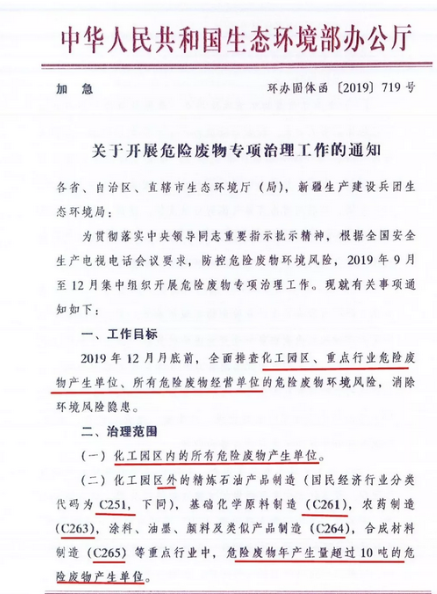 日前生態環境部印發加急文件《關于開展危險廢物專項治理工作的通知》。 《通知》要求今年年底前,在全國范圍內排查化工園區、重點行業危險廢物產生單位、所有危險廢物經營單位的危險廢物環境風險,消除環境風險隱患。[ 查看更多 ]